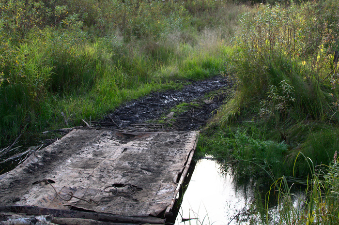 Дорога мне не нравится. С одной стороны, это насыпь и машина не проваливается, слева-справа болото небольшое и не переливает. Но колея глубокая, а мосты и резина у меня самые обычные, да и вообще, уазик в тайге не особо едет. Однако то, что это единственная дорога из этой деревни, сводит выбор к одному варианту. Еду потихоньку, в основном боком, чтобы не сползать в колею. Время от времени машина весело плюхается и висит даже не редукторами, а сразу осями, бултыхая колесиками в воде. Глубина по колено, но на дне лужи грунт держит, так что просто копаю и еду. Спустя четыре часа я уже в двух км. от деревни, но темнеет и в очередной, особой большой луже просто остаюсь ночевать. Пес ест корм, я ем сало и печеньки, съедаю горсть глюкозы и мы идем гулять. Находим речку, мост, проходим по полям, пес гоняется за совой, веселимся. Кругом темно и необычно тихо, никто не кричит, как в лесу. Переодеваюсь в сухое и мы просто сопим в машине (N1).