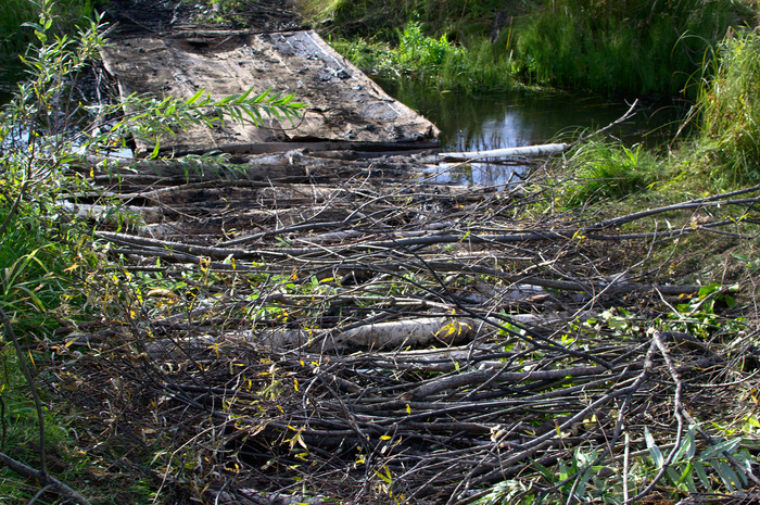 На спуске к мосту топко и на ночной прогулке я подумал его укрепить. Но уже лежат свежие ветки, так что просто разравниваю пару ям на подъеме, который выглядит очень даже неплохо. Переезжаю неспеша и сразу проваливаюсь. Куча палок, наложенных вдоль, позволила думать, что это надежно, но нет. Жерди разъехались, задние колеса утонули. На фото спуск, а подьем я даже не сфотографировал, уж больно нормально он выглядел.