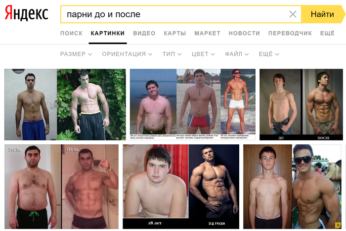А для запроса "парни до и после", также без уточнения до и после чего, мы уже увидим результаты походов в качалку.