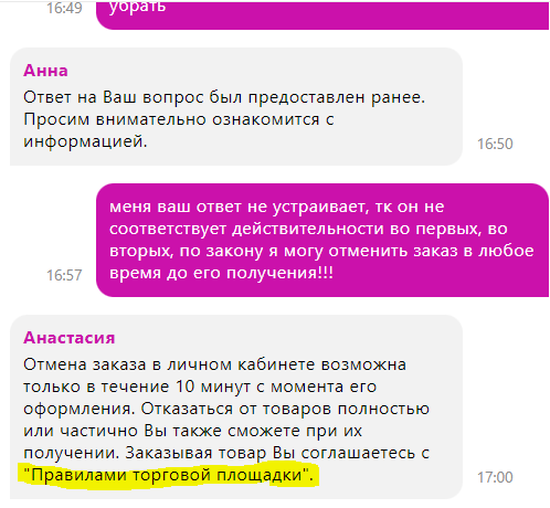 Хорошо, иду ещё раз в доставку, все протыкиваю, нет такого пункта для отмены, при этом с момента заказа 10 минут ещё не прошло. Пишу в чат, там меня футболят своими волшебными 10 минутами и на аргумент, что по закону я могу отменить в любое время, в меня тыкают своими "правилами торговой площадки":