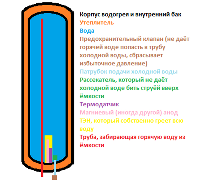 Кроме бака в водогрее есть ещё слой термоизоляции и внешний корпус (далее схемы будут на круглых, но для плоских, если не вдаваться в ненужные подробности, будет тоже самое, почти, не паримся, мы ща про принципиальное устройство):