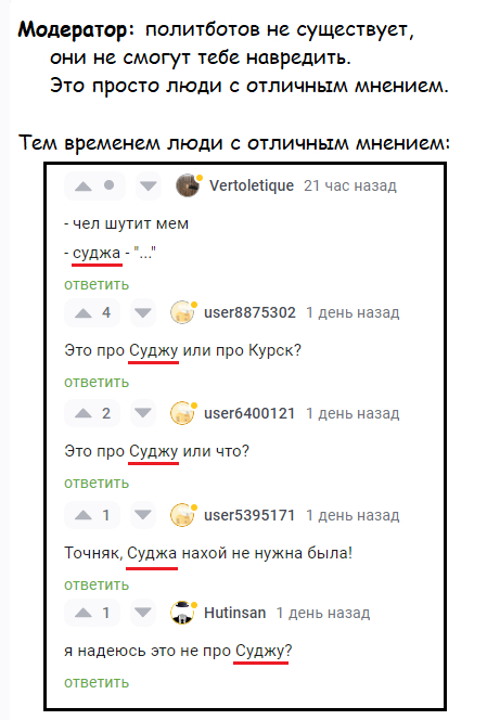 Но блин. В последнее время меня стало доставать обилие необычных аккаунтов, которые постят откровенную пропаганду, прячась за обтекаемыми формулировками. Или особо не прячась. Постоянно вижу комментарии, в которых призывают наносить удары по российским городам, убивать россиян, распространяют ненависть ко всем участникам СВО и даже предлагают донатить ВСУ. Из-за своей невероятной доброты обтекаемых формулировок наши модераторы не имеют возможности банить таких пользователей.