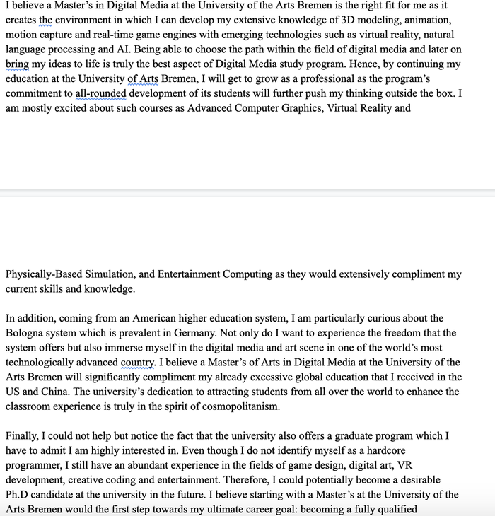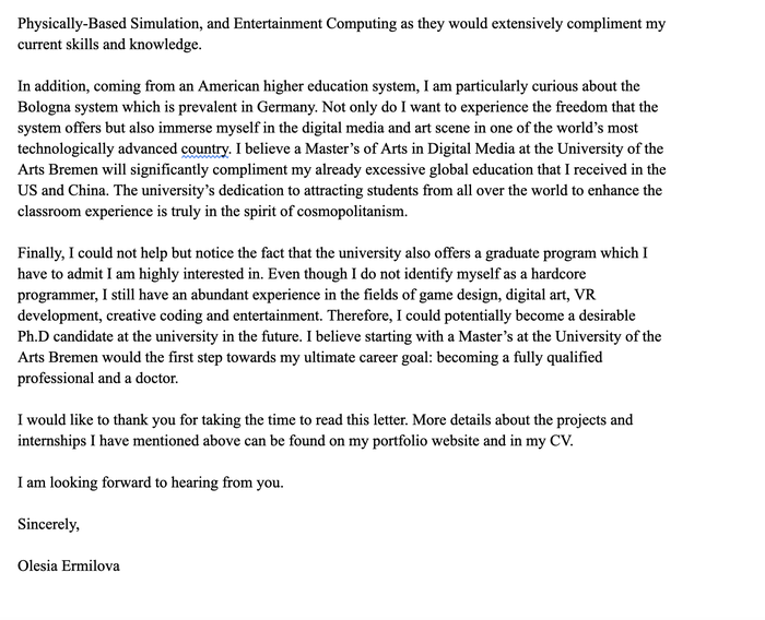 Привет всем! Это снова Олеся. Я закончила в этом году бакалавр New York University и поступила в Германию в Кельн по направлению Game Design на магистратуру. Я писала уже посты и про сам процесс поступления, и про советы по поступлению, посему в этом посте хотелось бы отметить конкретно процесс написания мотивационного письма в Cologne Game Lab и Bremen School of the Arts, куда я тоже поступила.