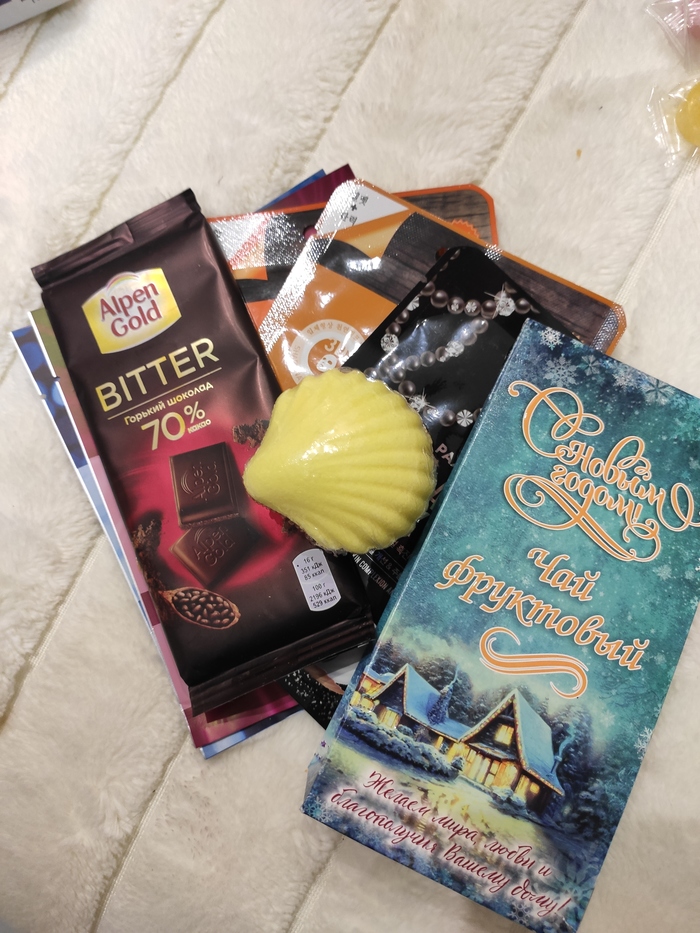 Вкусняшки,шоколад, чай, куча чокопаев, сладости и какие-то женские штучки =) для жены