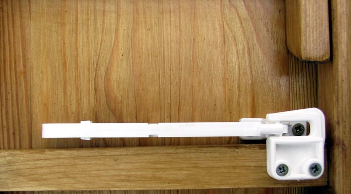 На этой рейке и закрепляется пластиковый оконный фиксатор, позволяющий регулировать угол наклона столешницы и фиксировать её в выбранном положении.