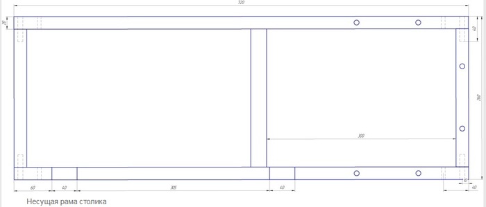По четырём углам несущей рамы просверлены отверстия диаметром 8 мм и глубиной 40 мм под буковые шканты для усиления конструкции.
