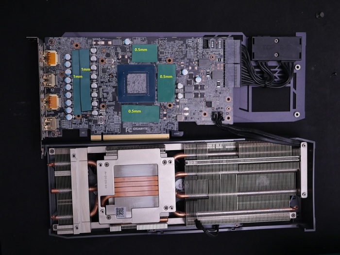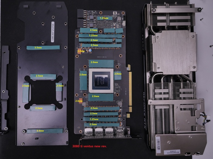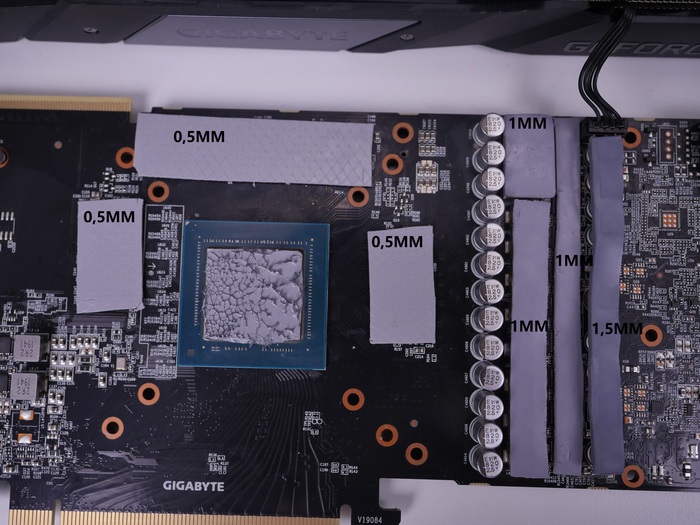 Это самые точные размеры прокладок (0.5 мм), исходя из опыта. по заводу там стоят 0.75мм на памяти и они ультрамягкие, что как бы позволяло им расплющиваться, но всё равно прижим процессора был неплотным и как только паста высыхает идёт возрастание температур. По дросселям и мосфетам (1мм) датчик Hot spot. 1.25 мм с завода аналогично мешают прижиму. Сами прокладки с завода белого цвета с посредственными показателями я бы не сказал, что они высохли, но их свойства были утеряны запрограммировано. Frost mining Extremal Thermal pads V3 15W. ставил эти. есть еще версия побогаче розовые W20. но они стоят в 2 раза дороже и есть резон их ставить на карты побогаче.