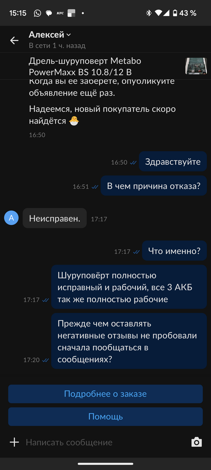 В целом, отправил шуруповёрт, человек его благополучно не принял и вместо каких то разбирательств просто оставил отрицательный отзыв: