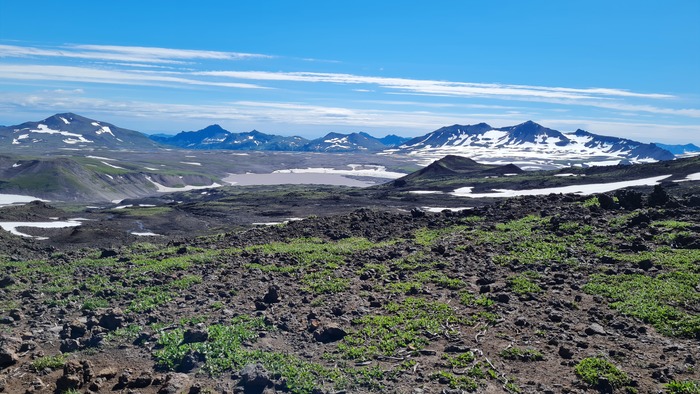 Приехали на плато у подножья вулкана. Там остаются автомобили и начинается восхождение, а некоторые сразу там устанавливают палатки или продвигаются дальше, к домашним гейзерам (мутновская ГЭС).