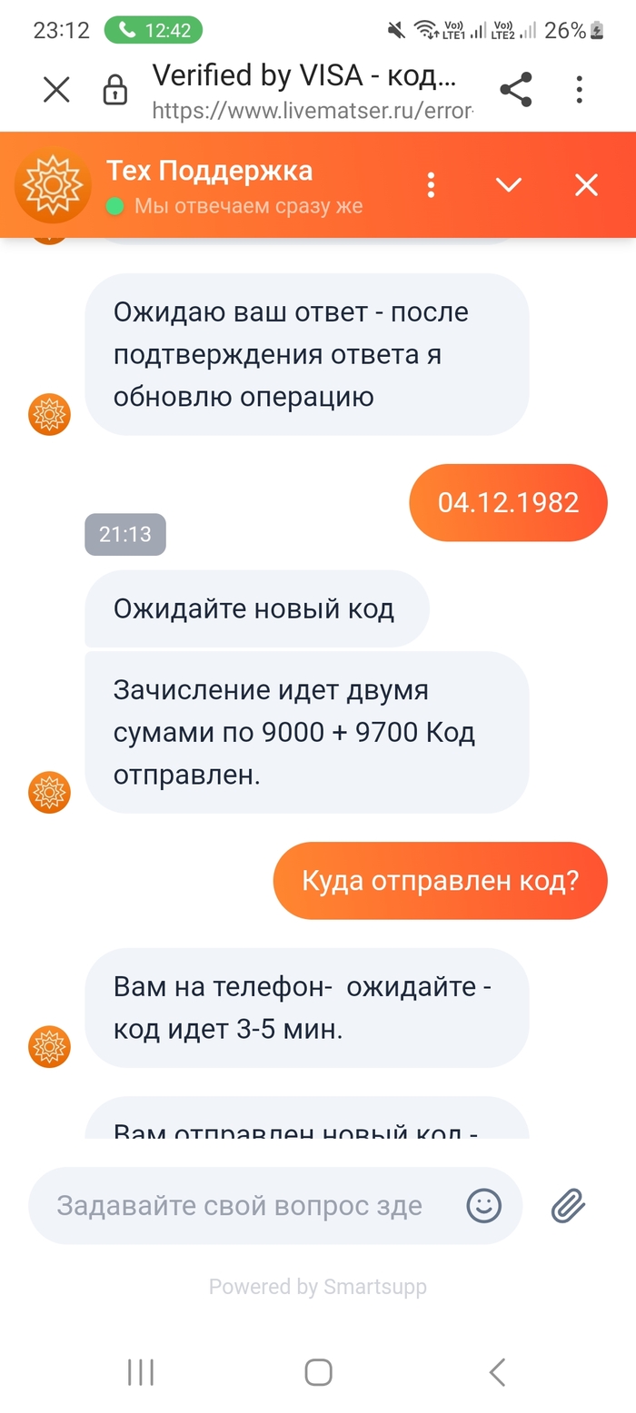 Тут начали поступать пуш уведомления от банка, что произошло списание 9000р. Я проверила карту и увидела, что списано гораздо больше, т.е. уведомления приходят с задержкой. (И опять ошибка, нет бы остановиться и подумать). Я сообщаю "заказчику", что списание происходит вместо зачисления. Ответ, что это сбой, такое уже было, срочно свяжитесь с "техподдержкой" и кидает мне ссылку. Ну и я перехожу уже и по этой ссылке. В этот момент мозг полностью выключил критическое мышление😭 Тут же эта липовая поддержка сообщает, что деньги списаны ошибочно, что нужно ввести слово ОТМЕНА, придет опять код, я его введу и мне зачислятся стоимость товара + ошибочно списанный товар. БИНГО, я снова вводу код. И снова списываются деньги. Это часть скринов переписки с липовой поддержкой.