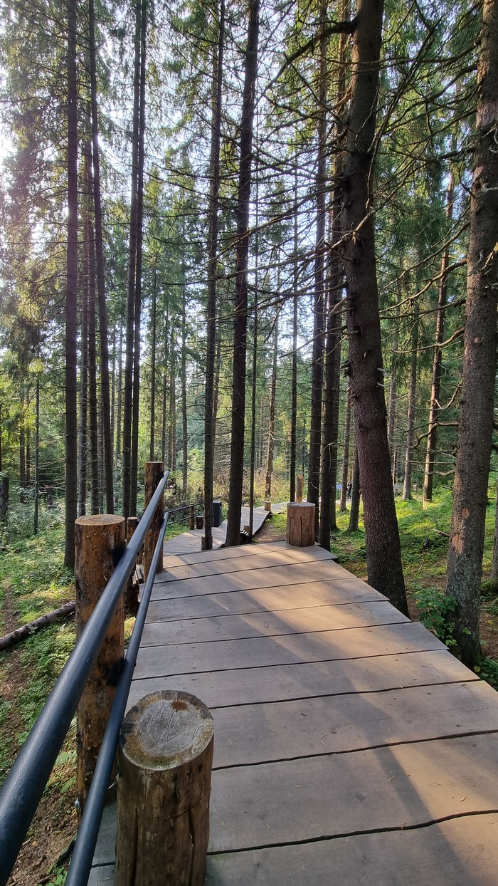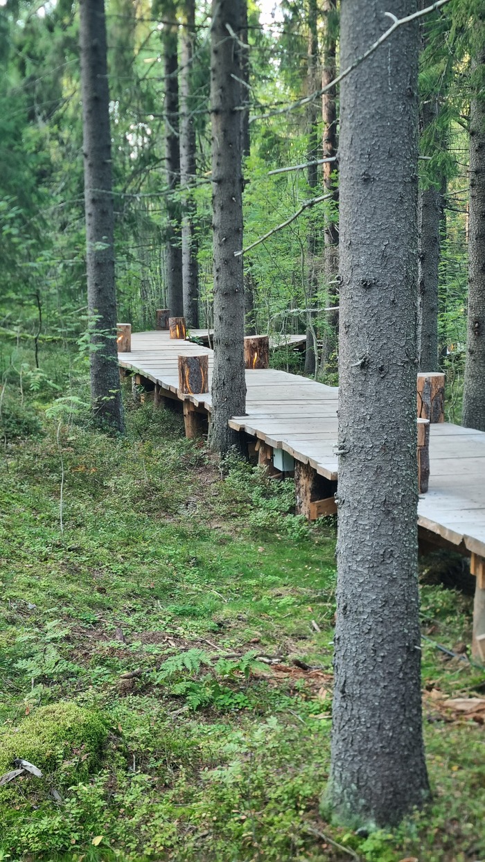 Для удобства туристов проложена эко тропа – деревянные мостики и ступеньки по которым следует идти на маршруте, и установлены информационные стенды, повествующие о раскопках, находках, и истории места. Вход платный, не помню точно стоимость около 300-400 руб./чел. Обязательно нужно подняться на верх. Иначе смысла никакого в данном посещении нет. Это одно их из лучших мест, которые я видела. Панорама лесных массивов, река блестит в лучах солнца; с другой стороны озеро, и рускеальский экспресс можно увидеть. Это одно из тех мест, где время застывает. Говорят, здесь закаты невообразимой красоты. Скорее всего так и есть, но мы не застали, до закаты было слишком далеко.