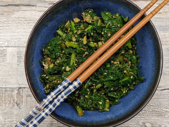 Ну и ничего толкового я не выкурила - одни хипстерско-копирайтерские высеры, ах польза и вред, витамины-минералы, смузи-хумузи, ешьте сырым и вареным и прочий бред. Не знаю, может, сейчас уже есть что-то внятное, тогда не нашла. Пробовала я так и эдак. Сырым невозможно, с таким же успехом можно жевать брезент. Молоть в смузи - гадость не моё. Ошпаренный ненамного лучше, все равно жесткий. В рагу, суп - теряется среди остальных овощей, не понять, зачем был нужен. Короче, так я на него и перестала обращать внимание, пока не попалась мне на просторах ютуба одна англоязычная корейская тетушка, которая очень лихо готовит национальные блюда. И вот у нее, в подробном видео про пибимпаб, я и подсмотрела как корейцы готовят листовые овощи - например, шпинат. А еще она адаптировала под свой традиционный способ еще какую-то американскую разновидность листовой капусты, она называетcя Collard - на вид немного на кейл похож, но длинные черешки и не кудрявый. Короче, я пошла дальше и проверила с кейлом. И ожидаемо он этому способу подчинился просто прекрасно!.. И вот сезон, он опять появился в продаже, так что я снова готовлю ужин и попутно фотографирую для вас )))).