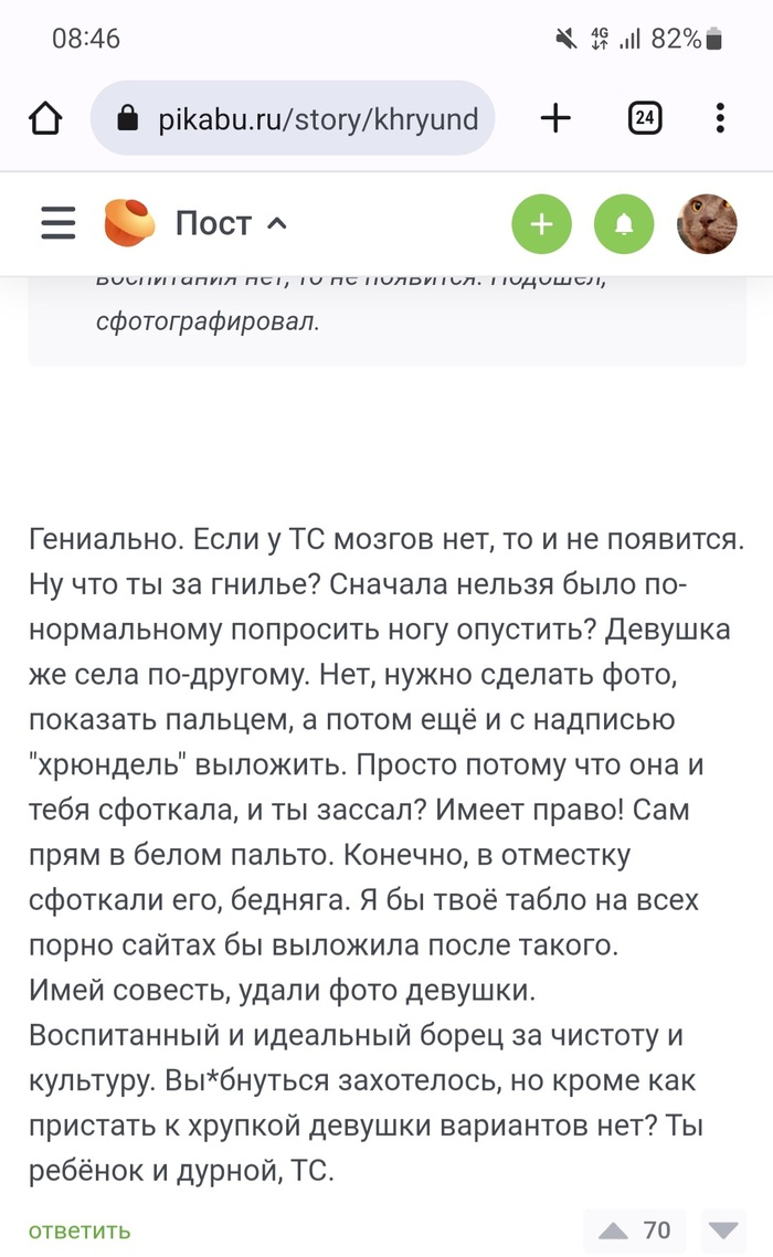 В котором попытался обвинить в отсутствии воспитания девушку, которая поставила ногу на скамью. Опубликовал и её фотографию, но через какое-то время под давлением пикабушного общественного мнения удалил. Пикабушное общественное мнение категорически не поддержало автора, обвинив его в лицимерии, и отчасти трусости.