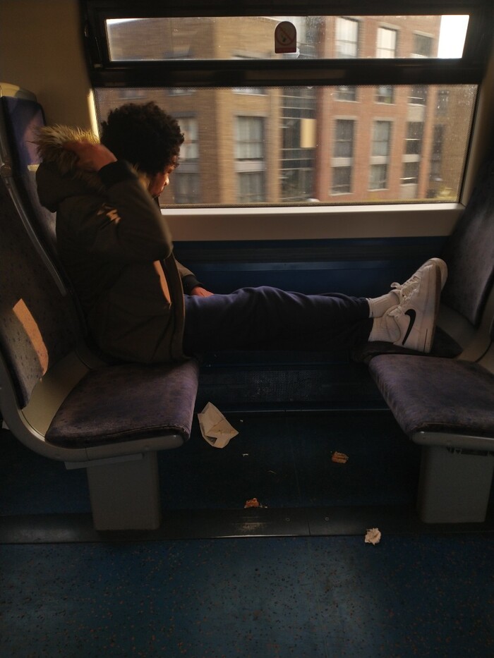 Я года 4 назад, тоже сделал фотографию чувака закинувшего ноги на сиденья поезда. Вот она