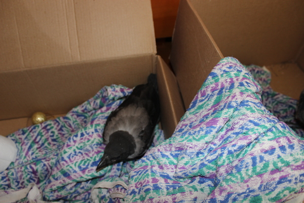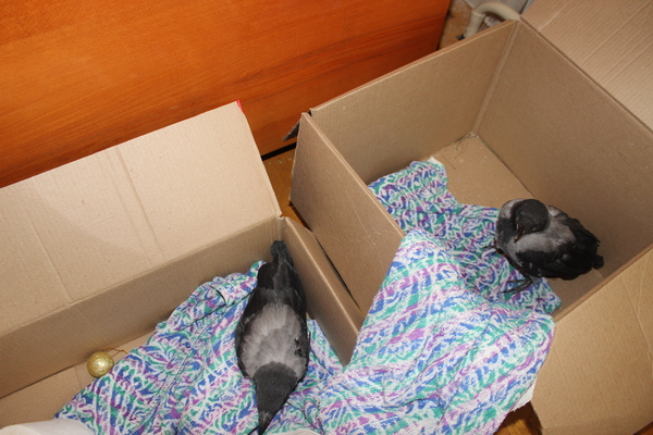 Кто что подскажет. Сегодня во дворе выпали два воронёнка, подобрал с незнакомой девушкой обоих, жалко. Спец.служб нет, куда могли отдать, не берут, говорят могут заразить. Пока у девушки на балконе, накормила, чем интернет пишет, едят всё. Уже взрослые, т.е. не лысые, только летать не могут. Сам лично ловил, за коробками бегал, было не до фоток, только сейчас есть фото. Родители воронят кружили, оборонялись, ругались, а что делать, пришлось "насильно" забирать.