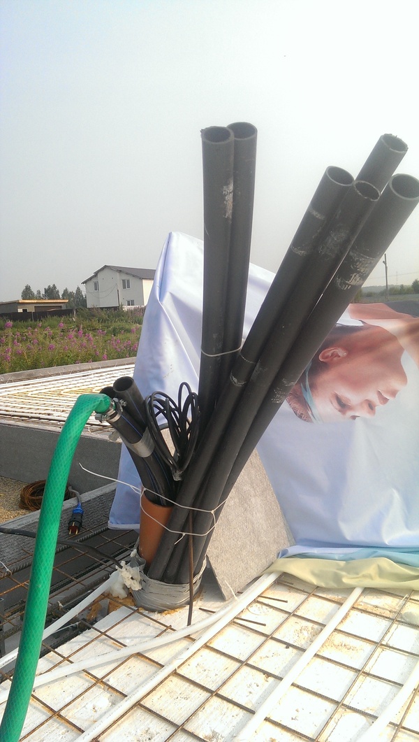 Тут мы уложили гильзы из пнд трубы под вводы/выводы в/из дома ЭЭ, слаботочки, воды, воды до бани, ээ до септика, грунтового теплообменника.