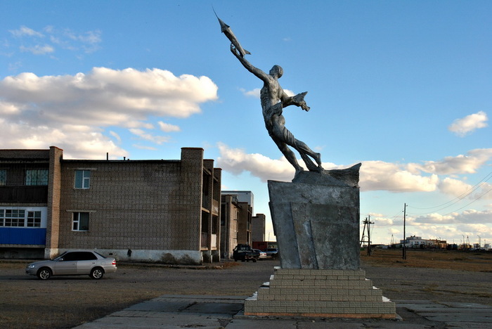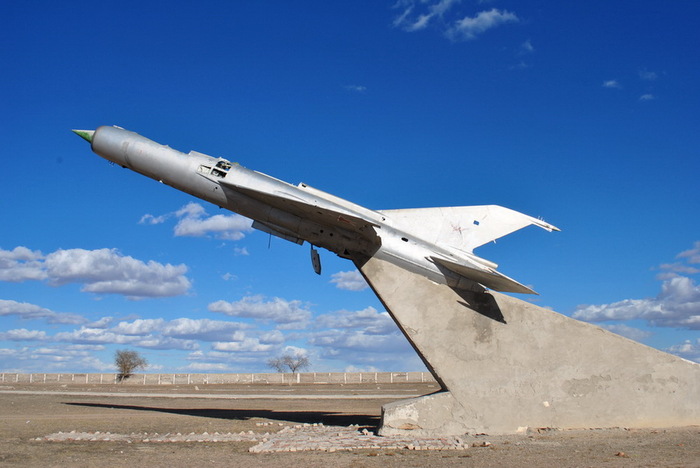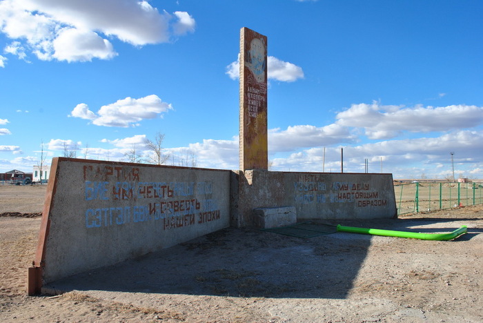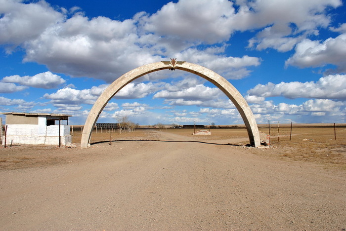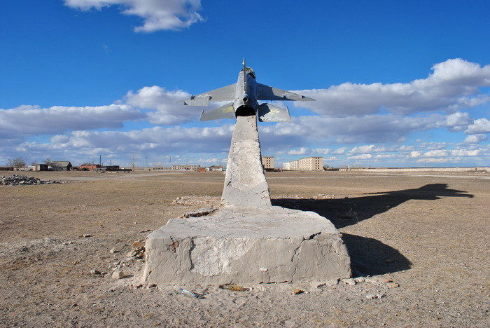 Баянтал встретил ржавым знаком «Летчик первого класса» на въездной арке.