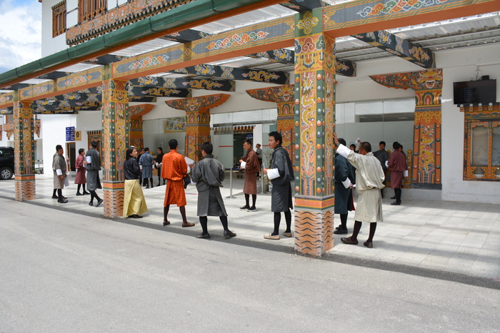 На выходе встречают гиды – приятные улыбчивые парни в традиционных нарядах. Но это не показательные выступления для туристов: в Бутане обязательное ношение традиционной одежды шесть дней в неделю. Народ, кажется, особо не возражает, и многие не переходят на джинсы даже в воскресенье.
