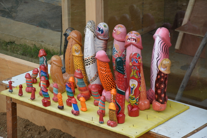 На следующий день едем в деревню членов. Предысторию уже не вспомню, но тут все верят, что члены на стенах домов оберегают от злых духов, а поделки соответствующей формы приносят удачу. А ежели в местном храме получить деревянным хером по лбу от правильного монаха в правильный час, то и все болезни отступят.