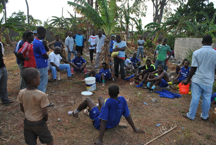 В перерыве команды расселись в грязи под пальмами вперемешку со зрителями, и все 15 минут сначала тренер, а потом директор клуба толкали выразительные речи, периодически делая резкие движения руками в области паха.