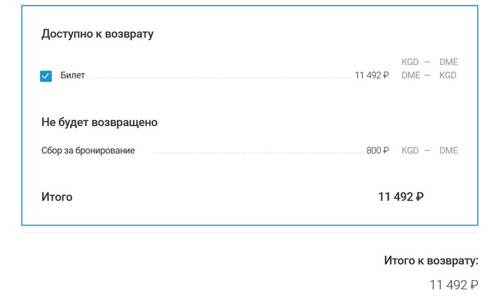Возникла необходимость перенести вылет. Зашел в управление бронированием, увидел кнопку «Оформить возврат», убедился, что при возврате удержат 800 рублей, а остальное вернут на карту в течение 30 дней.