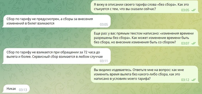 Кнопку «Обменять» не нашел. Звоню в колл-центр, где мне сообщают, что за обмен придется доплатить помимо разницы в стоимости еще 1000 рублей сбора. «Какого такого сбора?» -- интересуюсь. «А у нас сбор за внесение изменения в билет». «Так написано же, что обмен бесплатный». «Обмен бесплатный, а вот внесение новой информации в билет за деньги!» — уверенно отвечает девушка. Понимаю, что перспективы дальнейшей дискуссии туманны, и пишу в чат оператору с тем же вопросом. Хоть скриншотов наделаю. Через 7 часов глубокой ночью получаю те же самые ответы про сбор за внесение изменений.