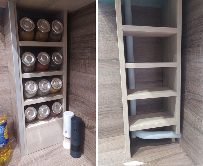 Фартук мы заказывали вместе с кухней под цвет столешницы, думали как же закрыть трубу слева от плиты и решили сделать стеллаж - я разметила полочки до трубы, фигурно вырезала и закрыла панелью снизу, сбоку прикрепила кусок фартука, в итоге специи закрывают нашу трубу и всегда под боком при готовке.