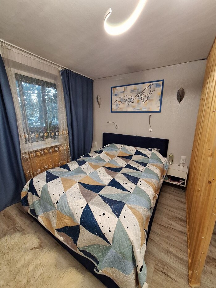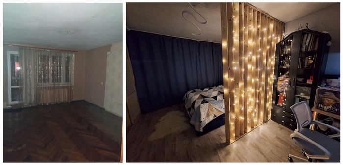 Наша спальня пока не дооборудованная, мы сколотили 2 перегородки деревянные, одна отделяет спальную зону, вторая выделяет рабочую зону. Тут еще много что хочется сделать но пока вот так. На НГ повесили гирлянду и так она прижилась у нас, что не стали снимать)