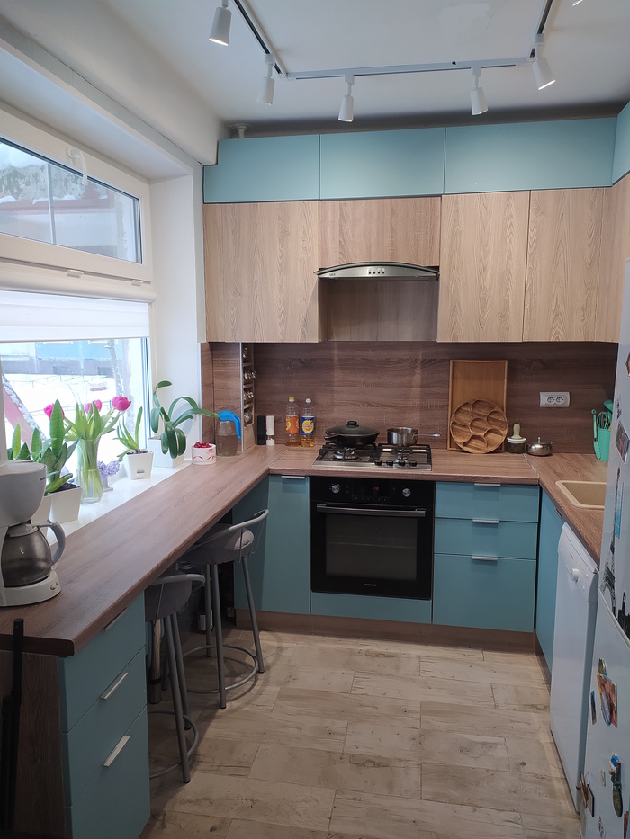 Правда мы с мужем думали, что на кухне есть почти не будем - в гостиной в основном, а тут чисто чай попить вечерком вдвоем, но на деле за эти два стула идет борьба, дети завтракают и смотрят в окошко, сидят на них и делают вид, что мне помогают в готовке, в общем оживленное место получилось.