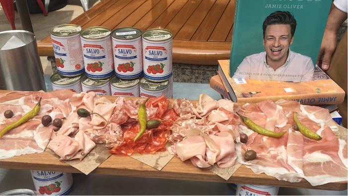 Поэтому я решил завязать со шведским столом и пойти в платный итальянский ресторан Jamie's Italian от Джейми Оливера - вот тут он всем улыбается с книжки при входе: