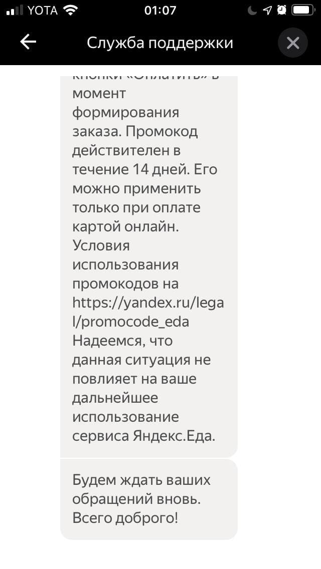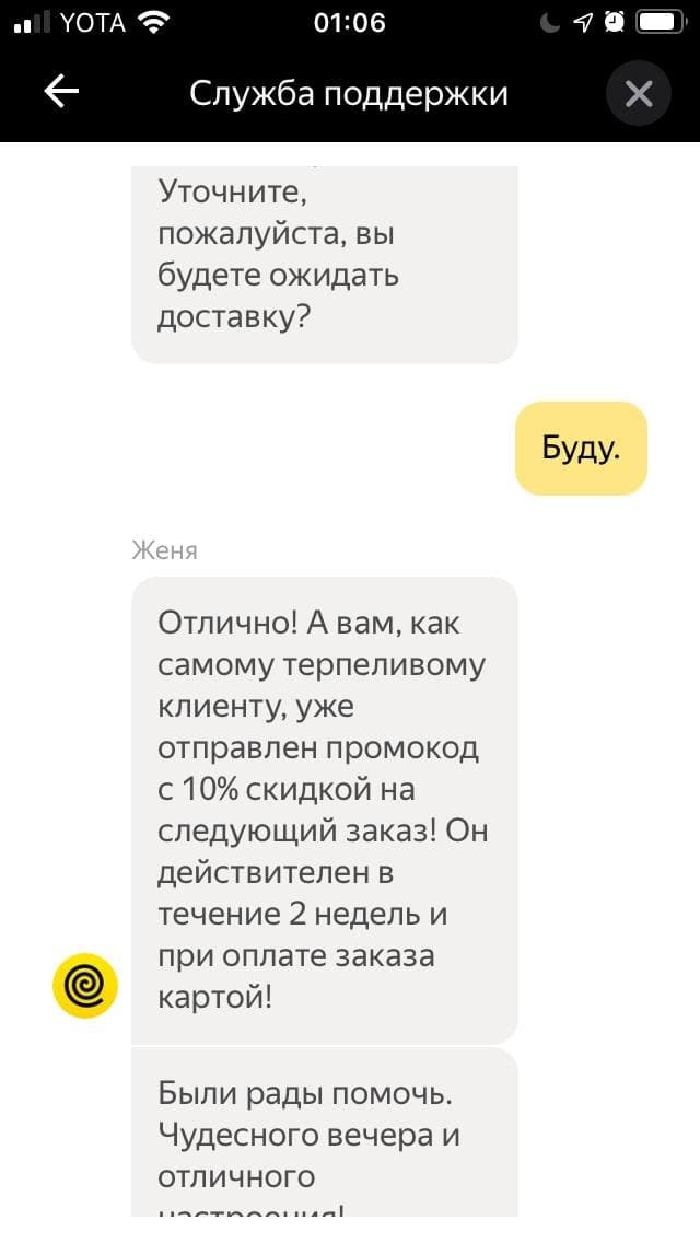 Человек на том конце поддержки отвечал 10 минут. Думаю - ладно, загружены, все дела. Нельзя же посчитать, что мой заказ не успевает даже приготовиться ко времени доставки, нельзя никак меня об этом уведомить. Наверное, сложное технически решение. Сотрудник выдал промокод и закрыл переписку, оставив меня наедине с голодом и неизвестностью - мол, закажи, чувак, чего-нибудь со скидкой, ну или подожди ещё сколько-то. Сколько? А никто не знает. Жду дальше, что ж делать.