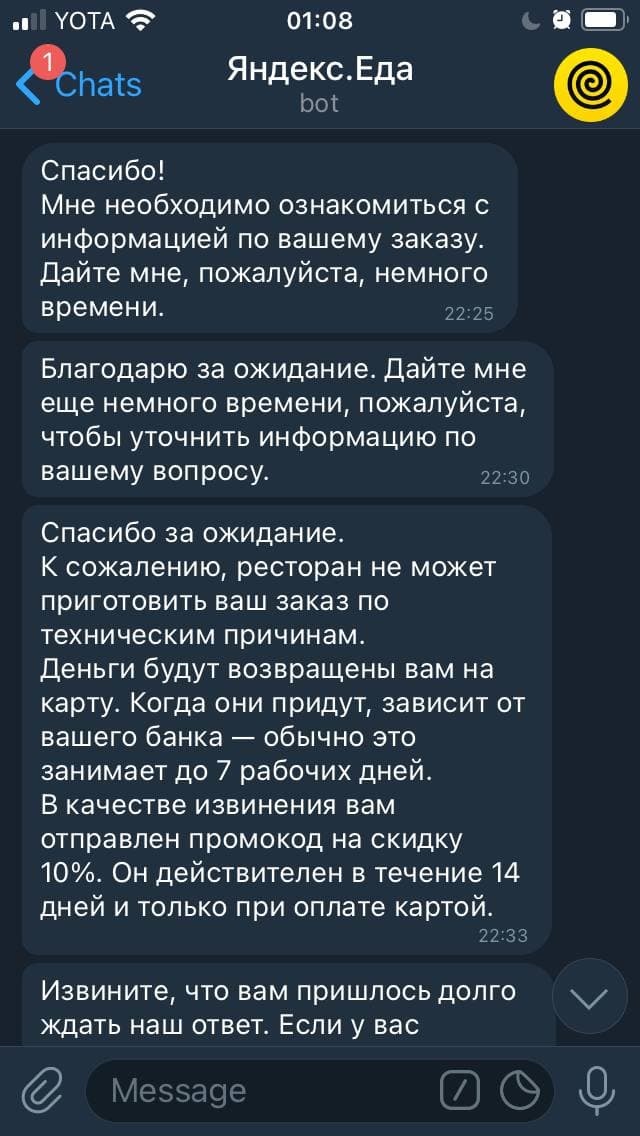 Вымаргиваю в 21:10, вижу что заказ всё ещё в статусе "не нуачо, готовим!", пишу в техподдержку. Дальше происходит это: