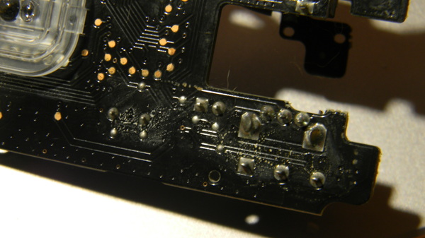 Мышь Steelseries Raw. Стала криво работать оптика, т.е, мышь движется лишь в определенных направлениях. Разобрал, снял с колёсика мыши кошачью шерсть, потом перевернул плату, а она вся в бёлых оттёках. Если честно, я в этом плане ноль, особенно меня конфузят совсем другие токопроводящие дорожки на чёрной плате, поэтому ничего трогать не стал, решил спросить.