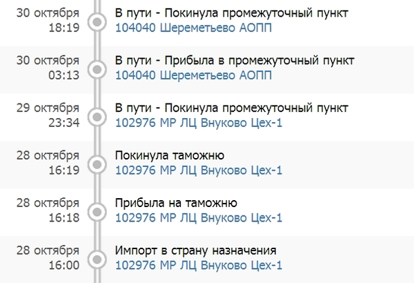 9 (девять!) дней. Ладно, видимо поездом шла. Паровозом. Но, почему в Москву? Хотя, я к тому времени уже привык к подобному. Тем более, что в Москве посылка пробыла всего пару дней. Следующего движения не пришлось ждать долго.