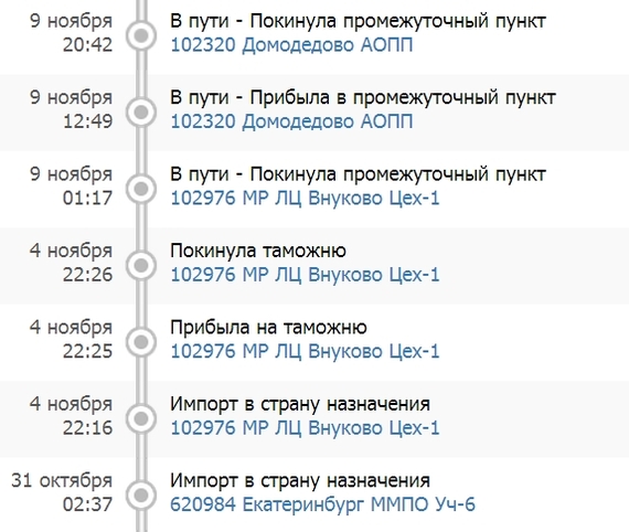 Я бы мог показать и другие приколы. Например, как посылка попала в Ебург и пролежала там полтора месяца, прежде чем я получил ее у себя в отделении. Я не знаю, забыли про нее, завалилась ли она за стол или куда еще, но спасибо и на этом. Были случаи, когда посылка поступила на почту Китая и добралась до России быстрее, чем она потом добиралась внутри страны ко мне.