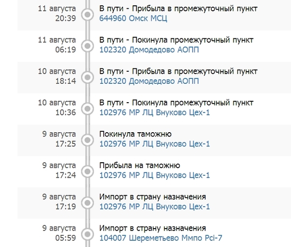 Это уже было выше, но вот еще один пример - может кто-то знает, зачем посылка катается по разным аэропортам? Ну, я могу понять, что посылка прибыла в один аэропорт, но из него в Омск рейсов нет. Тогда перевозим посылку в другой, откуда есть самолеты в Омск. Но, зачем катать по всем трем?
