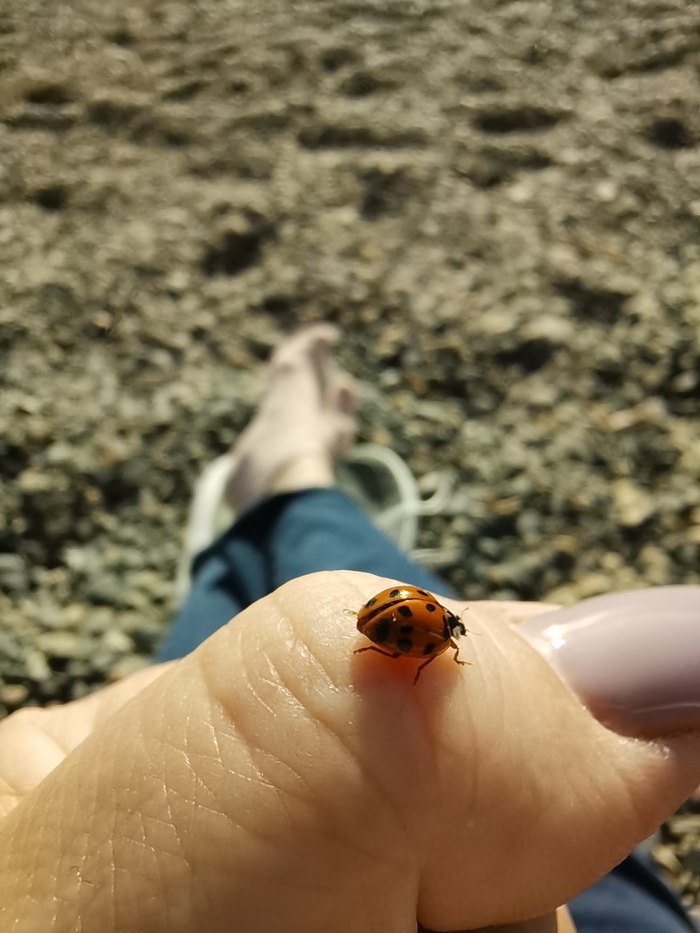 А еще я на море ездила в апреле, в Сочи. Там мне божья коровка на палец села)