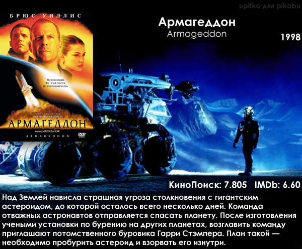 Актеры первой величины — Брюс Уиллис, Бен Аффлек, Лив Тайлер! 4 номинации на премию «Оскар»: за лучший звук, лучший монтаж звука, лучшие визуальные эффекты и лучшую песню! Песня из этого фильма «I Don’t Want to Miss a Thing» в исполнении группы Aerosmith в течение четырёх недель удерживала первое место в Billboard Hot 100. Мнения критиков были в основном негативными, но, тем не менее, фильм стал одним из самых знаковых событий 1998 года и заработал 553 миллиона долларов при бюджете 140 миллионов.