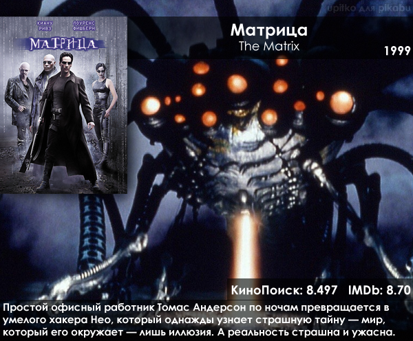 Четыре премии «Оскар» (лучший звук, лучший монтаж, лучший монтаж звука, лучшие визуальные эффекты). Режиссеры — Энди и Лана Вачовски. В ролях: Киану Ривз, Лоренс Фишбёрн, Кэрри-Энн Мосс и Хьюго Уивинг. Культовый научно-фантастический фильм, породивший два сиквела, комиксы, аниме и компьютерные игры. Невероятный философский сюжет, обросший спорами и дискуссиями и перекликающийся с платоновским мифом о Пещере. Фильм содержит целый ряд философских, религиозных и художественных реминисценций. В 2012 году он вошел в Национальный реестр фильмов Соединённых Штатов Америки.
