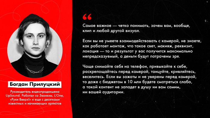 Богдан Прилуцкий советует начинающим артистам как можно чаще снимать самого себя. Важно знать свою рабочую сторону и понимать, что бы вам хотелось скрыть, а в чем вы, наоборот, максимально уверены. Чем больше времени в процессе съемки вы тратите на принятие себя, тем более скомканным получается результат.