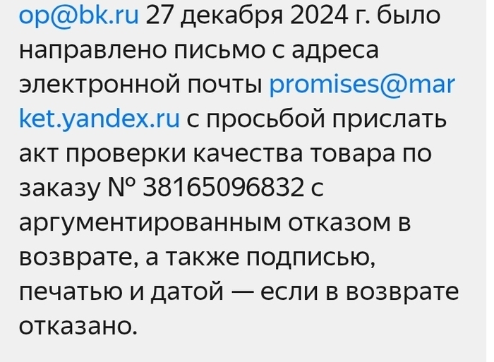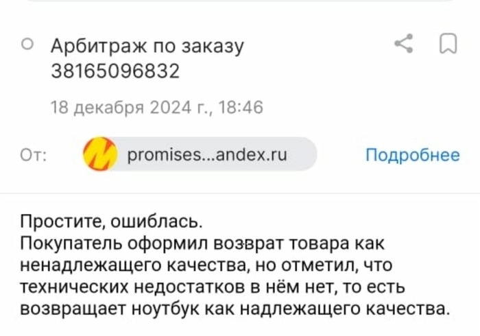 В это же время двумя днями ранее Яндекс Маркет закрывает арбитражный спор в пользу клиента с формулировкой о том, что мы не предоставили акт сверки ноутбука.