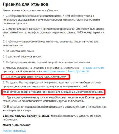 Пункт 10 - Почему статус «сделка сорвалась" с указанием одной звезды за то что он высказал свое мнение пропущены модерацией , если реальный статус сделки — это "не договорились"? Отзыв в данном случае это как выражение мнения пользователя, то почему его не переместить в ту категорию, где ему и место. С пользователем "не договорились»! Он не приезжал ко мне, не заказывал авито доставкой, чтобы сделка сорвалась! Он ушел писать ложный отзыв сразу , как только наш диалог закончился на том что я ему написал можете заказывать и далее уже начал молчать и игнорить!