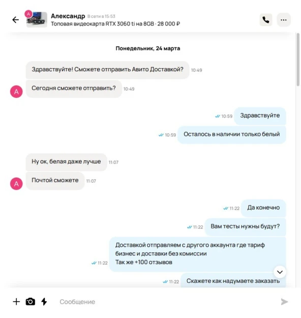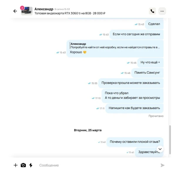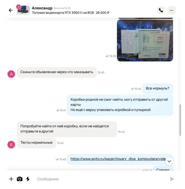 Мне написал потенциальный покупатель - "Александр", по поводу видеокарты RTX 3060 TI в черном исполнении.