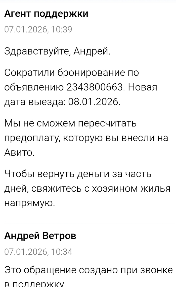 Отдельной песней было взаимодействие с поддержкой авито. Они сообщили, что сами деньги нам не вернут, надо требовать их возврата с арендодателя. И что вообще у них нет технической возможности вернуть эти деньги (причём утверждали это ещё во время нашего первого звонка из тараканьей квартиры с вопросом “что же делать?”, то есть до перевода денег арендодателям).