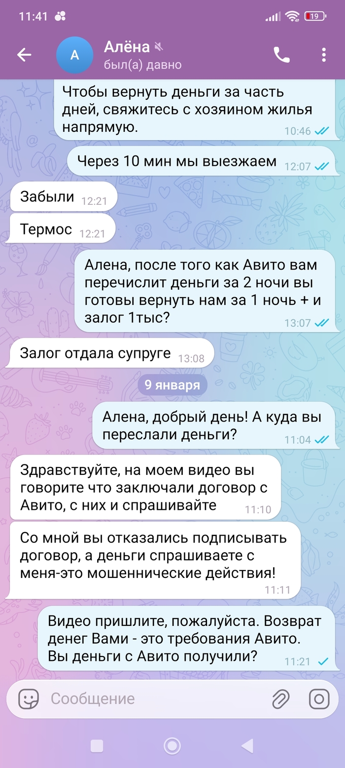 Написали арендодателю в телеграм и получили ответ “на моём видео вы говорите, что заключали договор с Авито, с них и спрашивайте. Со мной вы отказались подписывать договор, а деньги спрашиваете с меня - это мошеннические действия”. После этого арендодатель забанил меня в телеграм.