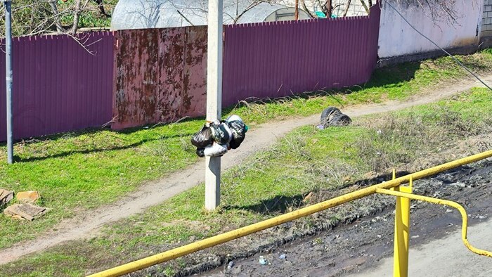 Мусор вешается на крючки в пакетах (что бы собаки не достали). По графику проезжает мусоровоз и пакеты сбрасываются в бункер.