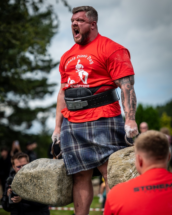 Первая задача — просто поднять два камня вместе с земли. Поднятие камней и стояние в положении «локаут» (ноги полностью выпрямлены, тело прямое и напряжено) с четкой фиксацией считается успешным подъемом.