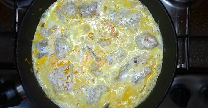 8. Оставляем овощи на сковороде, сверху выкладываем рыбу, заливаем сливочно-сметанной заливкой.