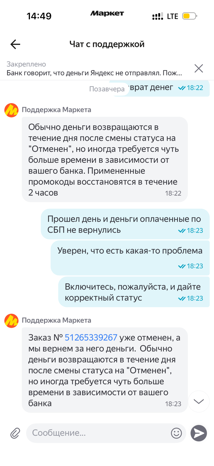 24.11 в 9.43 оформил покупку в ЯМ и оплатил ее по СБП с карты Т банка. Через 5 понял, что оплатить картой Альфы дешевле и решил отменить заказ. Нажал все положенные кнопки и заказ был отменен, Яндекс ласково прошебетал, что все ок и мои деньги уже летят ко мне.