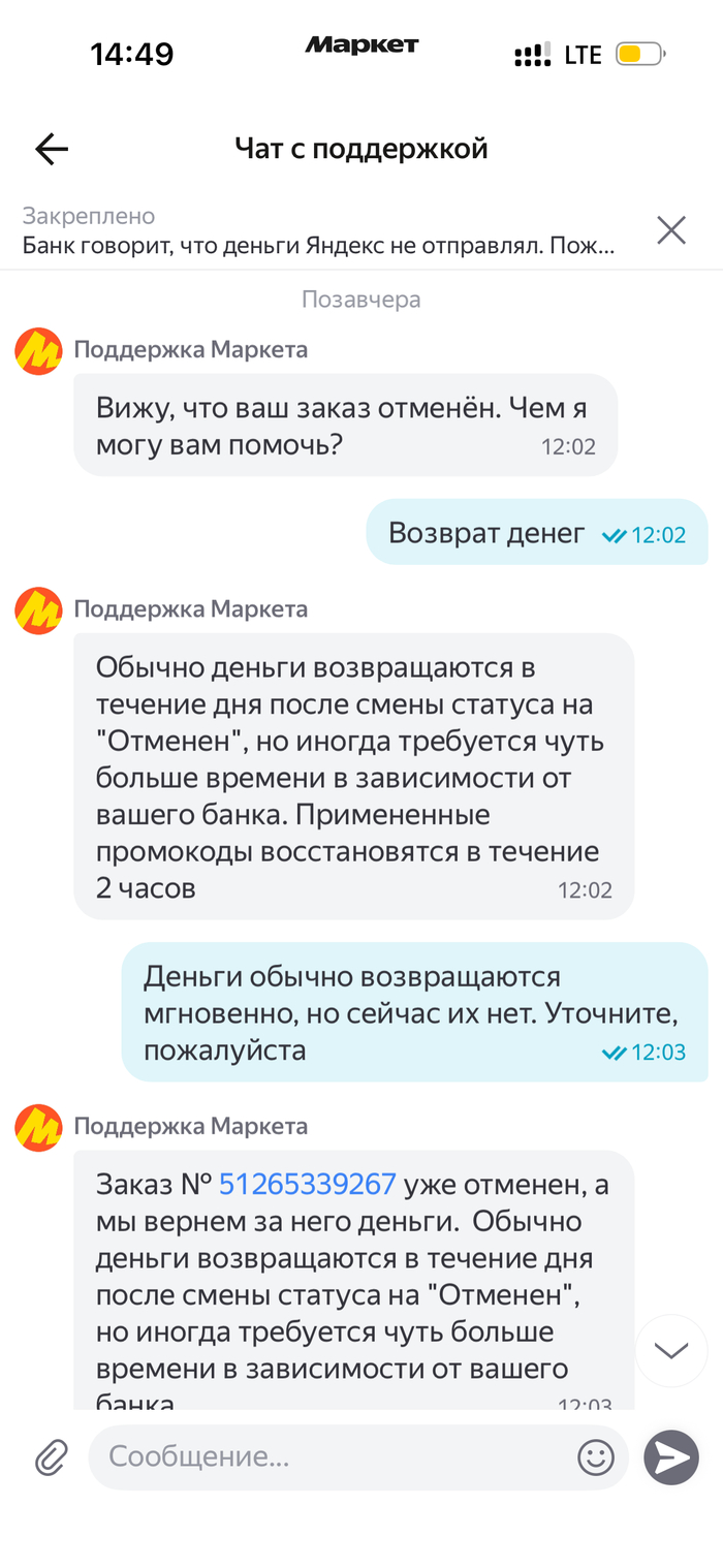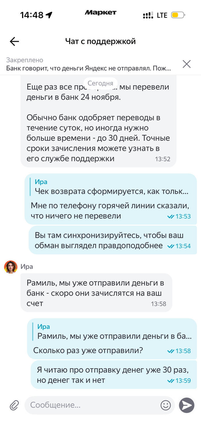 За это время была куча переписки в чате Яндекс, два звонка на горячую линию, но итог один. Мы вам деньги уже отправили вчера, сегодня или снова сегодня и мне нужно в банк идти мой, тк Яндекс красавцы и все сделали. Я даже в банк сходил сегодня и Т ожидаемо сказал, что денег нет и не поступало.
